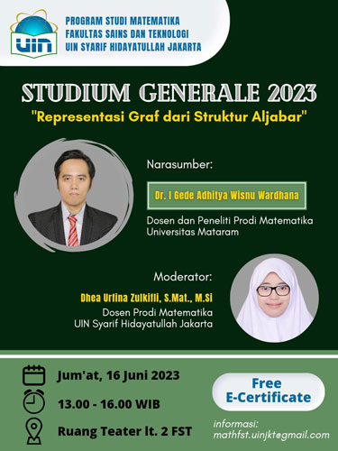 Nantikan Studium Generale “Representasi Graf dari Struktur Aljabar” dengan narasumber Dr. I Gede Adhitya Wisnu Wardhana, Dosen dan Peneliti Prodi Matematika Universitas Mataram.